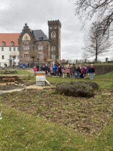 Anschließend gingen wir in den Schlossgarten, wo der Osterhase auf uns wartete. Trotz des schlechten Wetters hatte er sich die Mühe gemacht und für jedes Kind ein Körbchen versteckt. Die Freude war groß.