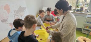 Neben der Theorie wurde auch fleißig experimentiert. In Kleingruppen führten die Kinder gemeinsam mit ihren Klassenlehrerinnen Frau Koudele und Frau Kirchner spannende Versuche durch. Sie erforschten unter anderem, warum Schiffe schwimmen, welche Gegenstände sinken oder schwimmen, wie sich verschiedene Flüssigkeiten im Wasser verhalten und wie man verschmutztes Teichwasser filtern kann.